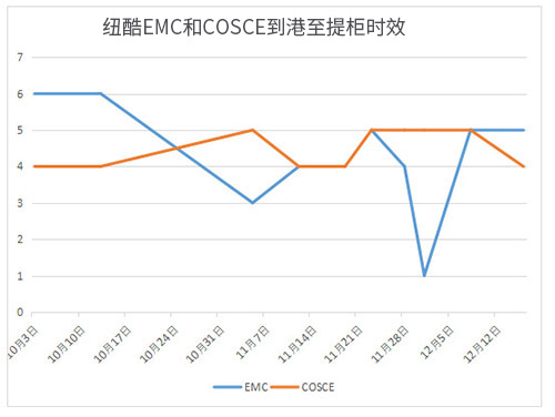EMC和COSCO在洛杉磯到港至提柜的時(shí)效曲線圖