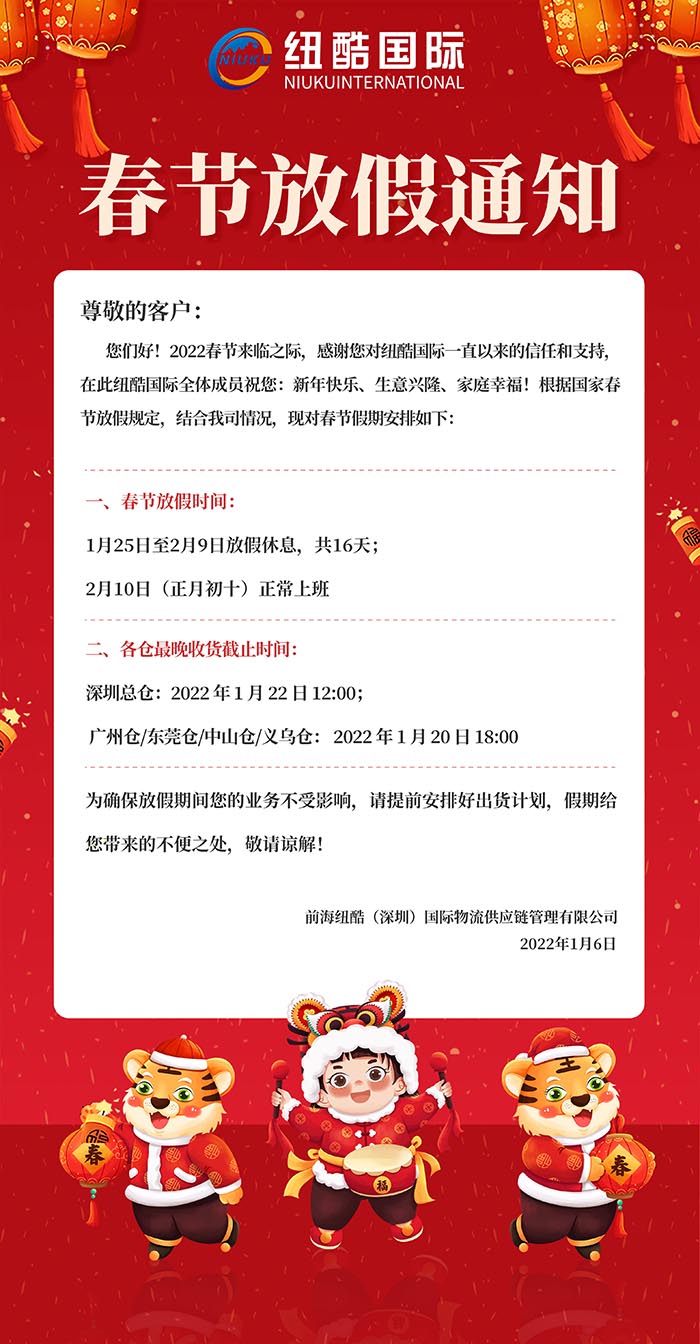 2022年紐酷國(guó)際春節(jié)放假通知。2022年春節(jié)來(lái)臨之際,感謝您對(duì)紐酷國(guó)際一直以來(lái)的信任與支持。在此,紐酷國(guó)際全體成員祝福您:新年快樂(lè)、生意興隆、家庭幸福!根據(jù)國(guó)家規(guī)定和我司具體情況,現(xiàn)對(duì)春節(jié)假期安排如下: