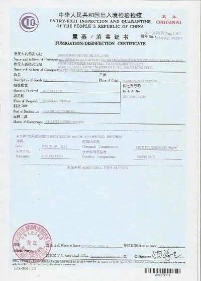 4)熏蒸(消毒)處理過(guò)的木質(zhì)包裝物要21天內(nèi)盡快出運(yùn),同時(shí)要注意單獨(dú)存放,并與其它未處理的木制品、木料隔離。 熏蒸(消毒)證書的有效期為21天。