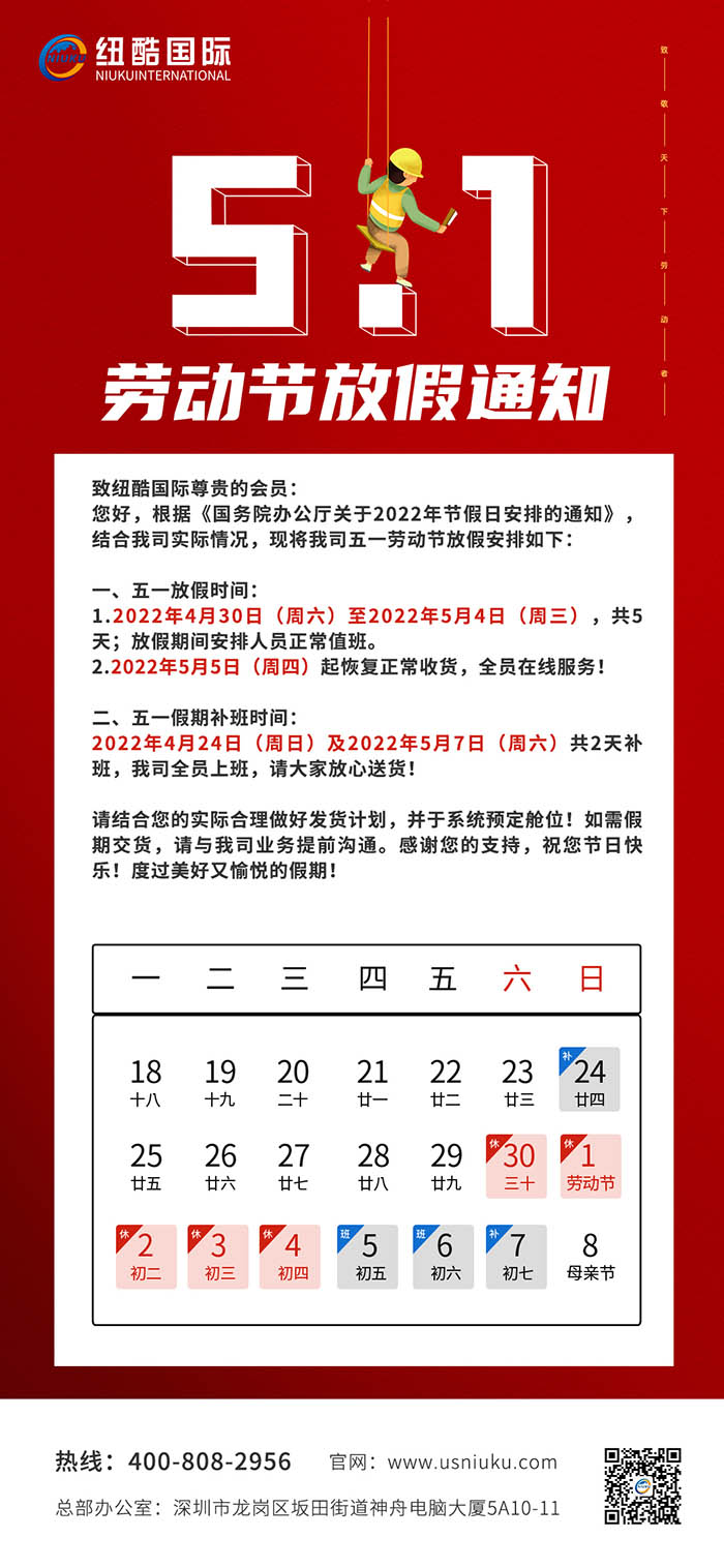 2022年紐酷國際五一放假通知